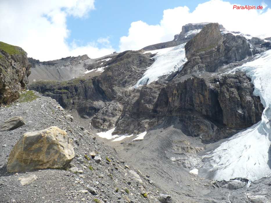 Startmöglichkeiten gibt es direkt neben der Hütte – einmal nach Nord in Richtung Kiental, und, wie wir gestartet sind nach Südwest, Richtung Kandersteg. Liegt kein Schnee ist der Untergrund feines Geröll, die Neigung ist optimal zum Auslegen und abheben, also absolut unproblematisch auch für Anfänger!