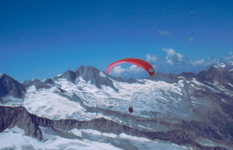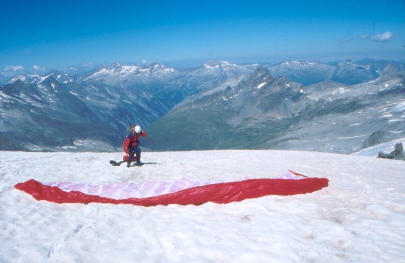 Der nächste Tag bringt anfänglich kaum Änderung denn der flache Charakter der Aufstiegsroute setzt sich nach wie vor fort. Es bei einer Höhe von 2300 Metern beginnt der Weg etwas steiler zu werden und man gewinnt langsam an Höhe. Unterhalb des Schwarzensteinkees wird´s aber schon wieder flacher und der Weg endet, falls kein Schnee mehr liegt, allmählich in den vom Gletscher ausgeschabten Rinnen und Mulden. Es sind aber genügend Steinmännchen vorhanden um die Richtung gut zu finden. Am Gletscher angelangt wird die ganze Sache etwas einfacher denn der Schwarzensteinsattel und der Gipfel sind von hier aus einfach zu finden. Das Schwarzensteinkees ist wie alles an dieser Tour nicht besonders steil, hat aber doch die eine oder andere Spalte auf die man achten sollte. Gestartet werden kann wenige Höhenmeter unterhalb des Gipfels in westliche Richtungen (SW - NW). Der Flug führt über die Berliner Hütte hinweg, weiter über die Aufstiegsroute hinunter in den Zemmgrund.